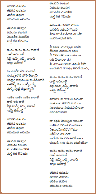 Inkem Inkem Inkem Kavale Song Lyrics In Telugu From Geetha Govindam Challabadi nanu nuvvu karuninchevaa… inkem inkem inkem kavale… chaaley idi chaaley… neekai nuvve vachi vaalaavey, ikapai thiranaalley, gundellonaa vegam penchaavey… gummamloki holi techhavey, nu pakkanuntey inthenemo ney, nak okko ganta okko janmai, malli putti chasthunnane