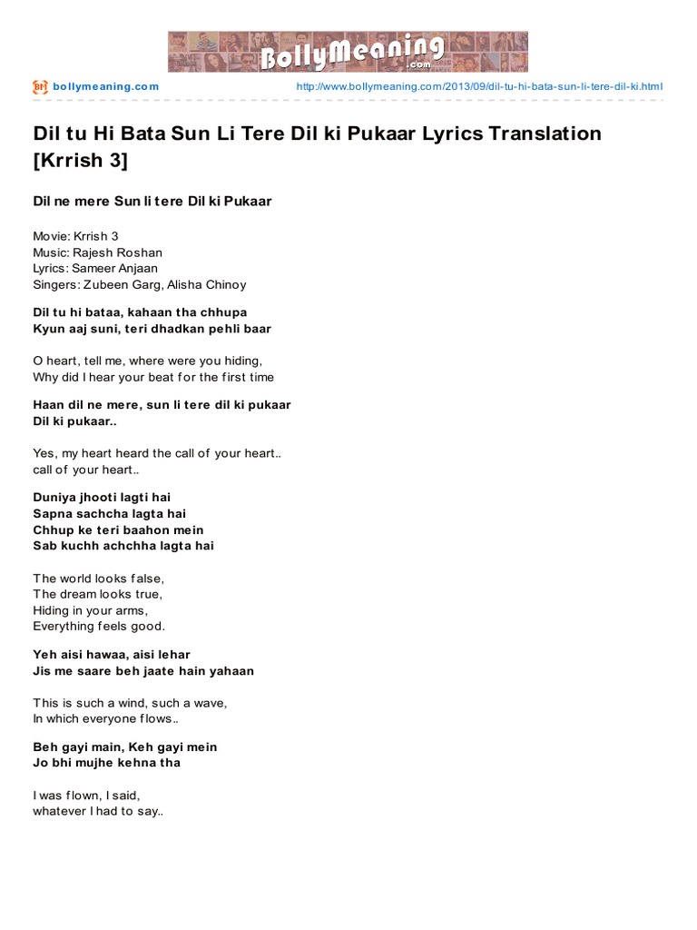 Bollymeaning Com Dil Tu Hi Bata Sun Li Tere Dil Ki Pukaar Lyrics Translation Krrish 3 Tu nahi dikha re maula.