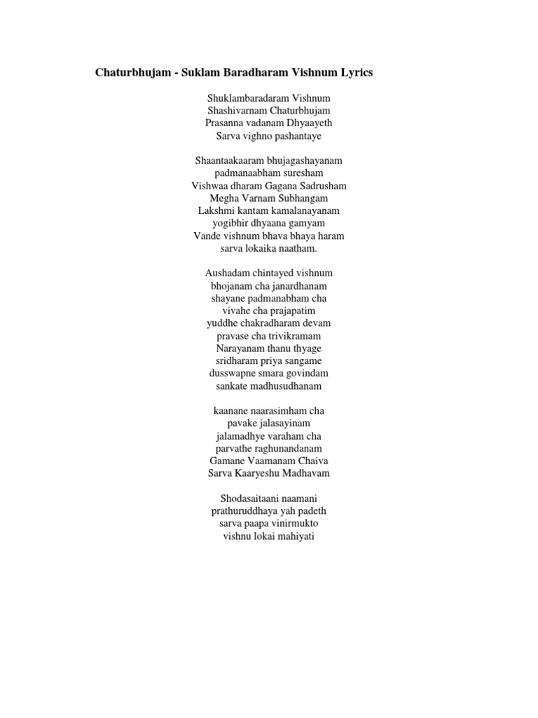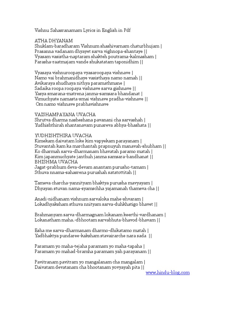 Vishnu Saharanama Stothram Saibaba Us Shuklambaradaram vishnum shashivarnam chaturbhujam prasanna vadanam dhyaaye sarva vighnopashaantaye shaantaakaaram bhujagashayanam padmanaabham suresham vishwaa dharam gagana sadrusham megha varnam subhangam lakshmi kantam kamalanayanam yogibhir dhyaana.